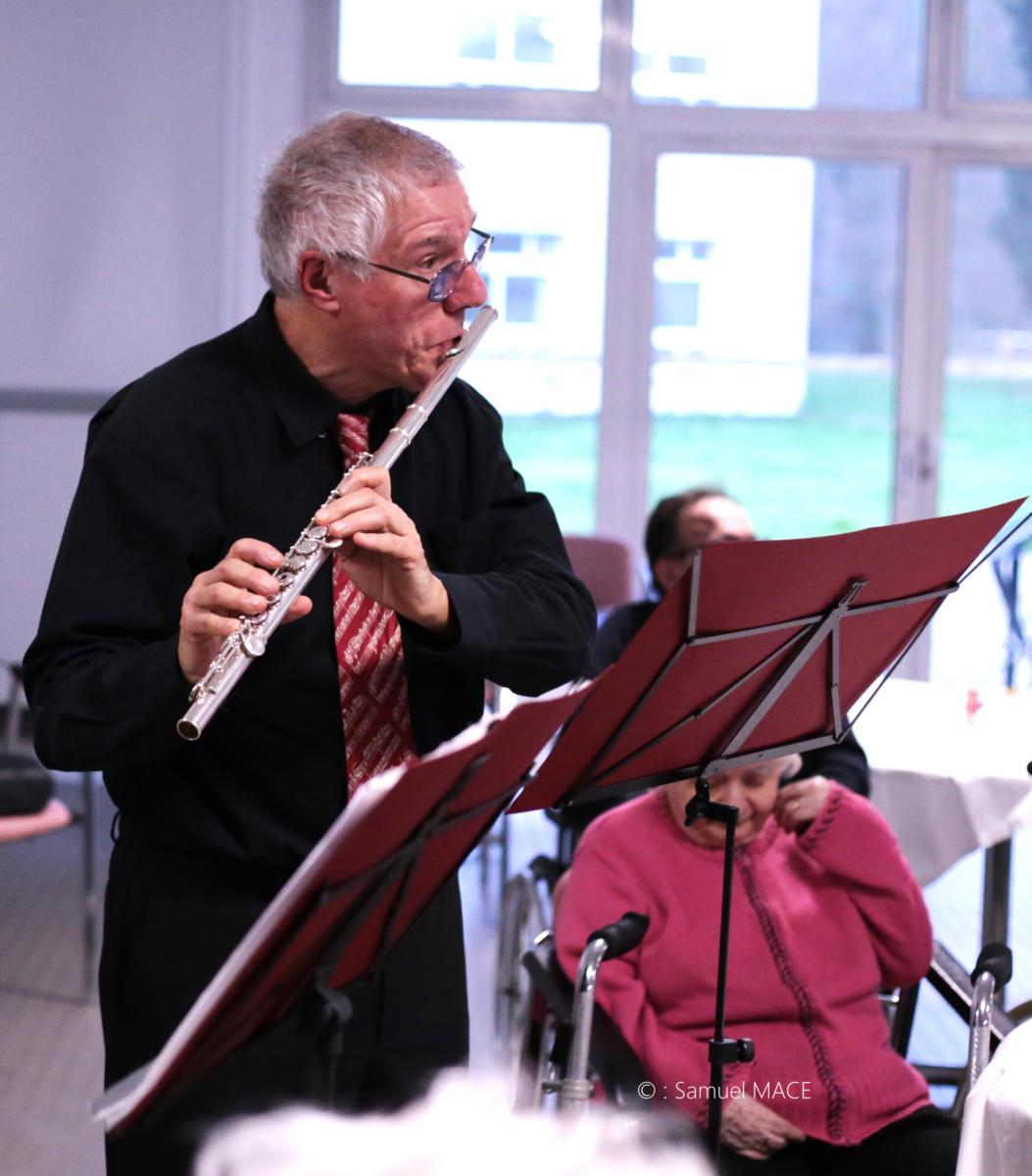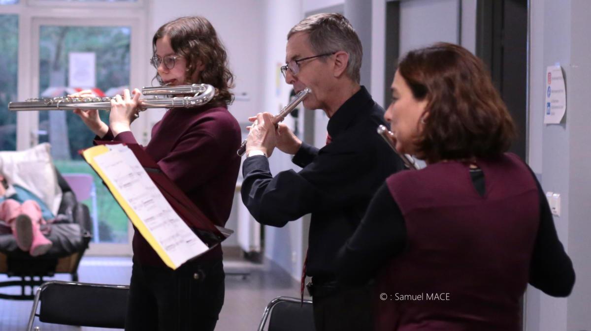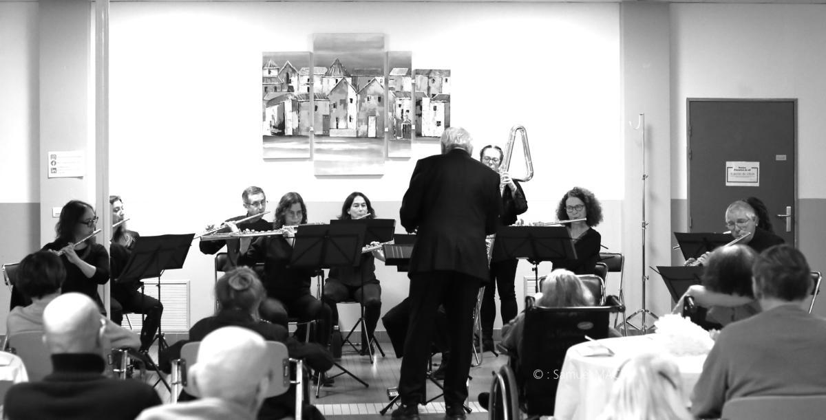Le 13 décembre 2025, l’ensemble Coeur de Flûtes a réalisé un concert à l’Etablissement de santé LA MARTINIERE à Saclay (91) réservé à nos ainé(e)s. Le déplacement de cet orchestre a permis aux personnes âgées, souvent éloignées du monde culturel par des soucis de mobilité, de découvrir des instruments parfois méconnus, de rencontrer les artistes, mais surtout d’écouter de la musique classique. L’ensemble a joué un répertoire très varié allant de Mozart au chant lyrique, en passant par quelques arrangements d’opérettes.